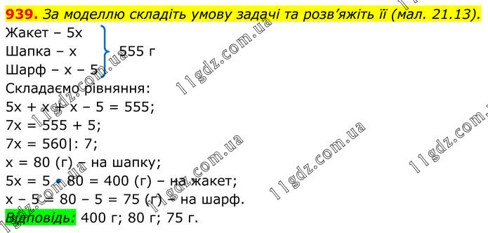 За моделлю складіть умову задачі та розв’яжіть її (мал. 21.13). Жакет – 5х Шапка – х 555 г Шарф – х – 5 Складаємо рівняння: 5х + х + х – 5 = 555; 7х = 555 + 5; 7х = 560|: 7; х = 80 (г) – на шапку; 5х = 5 • 80 = 400 (г) – на жакет; х – 5 = 80 – 5 = 75 (г) – на шарф. Відповідь: 400 г; 80 г; 75 г.