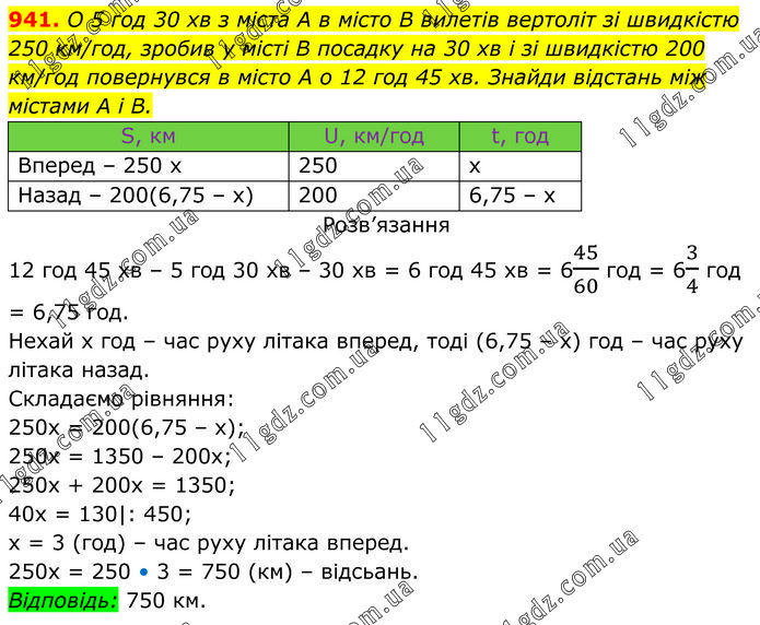 О 5 год 30 хв з міста A в місто B вилетів вертоліт зі швидкістю 250 км/год, зробив у місті B посадку на 30 хв і зі швидкістю 200 км/год повернувся в місто A о 12 год 45 хв. Знайди відстань між містами A і B. Розв’язання 12 год 45 хв – 5 год 30 хв – 30 хв = 6 год 45 хв = 645/60 год = 63/4 год = 6,75 год. Нехай х год – час руху літака вперед, тоді (6,75 – х) год – час руху літака назад. Складаємо рівняння: 250х = 200(6,75 – х); 250х = 1350 – 200х; 250х + 200х = 1350; 40х = 130|: 450; х = 3 (год) – час руху літака вперед. 250х = 250 • 3 = 750 (км) – відсьань. Відповідь: 750 км.