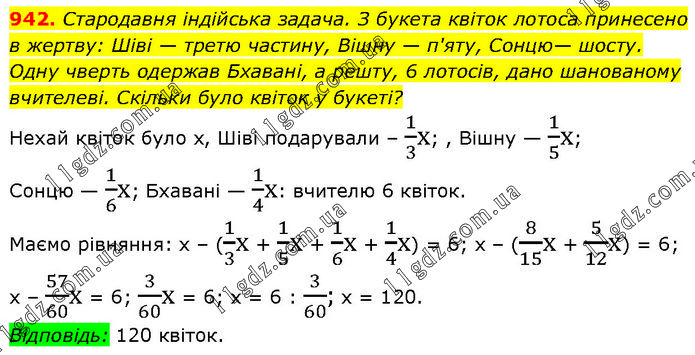 Стародавня індійська задача. З букета квіток лотоса принесено в жертву: Шіві — третю частину, Biшну — п'яту, Сонцю— шосту. Одну чверть одержав Бхавані, а решту, 6 лотосів, дано шанованому вчителеві. Скільки було квіток у букеті? Нехай квіток було х, Шіві подарували – 1/3х; , Вішну — 1/5х; Сонцю — 1/6х; Бхавані — 1/4х: вчителю 6 квіток. Маємо рівняння: х – (1/3х + 1/5х + 1/6х + 1/4х) = 6; х – (8/15х + 5/12х) = 6; х – 57/60х = 6; 3/60х = 6; х = 6 : 3/60; х = 120. Відповідь: 120 квіток.