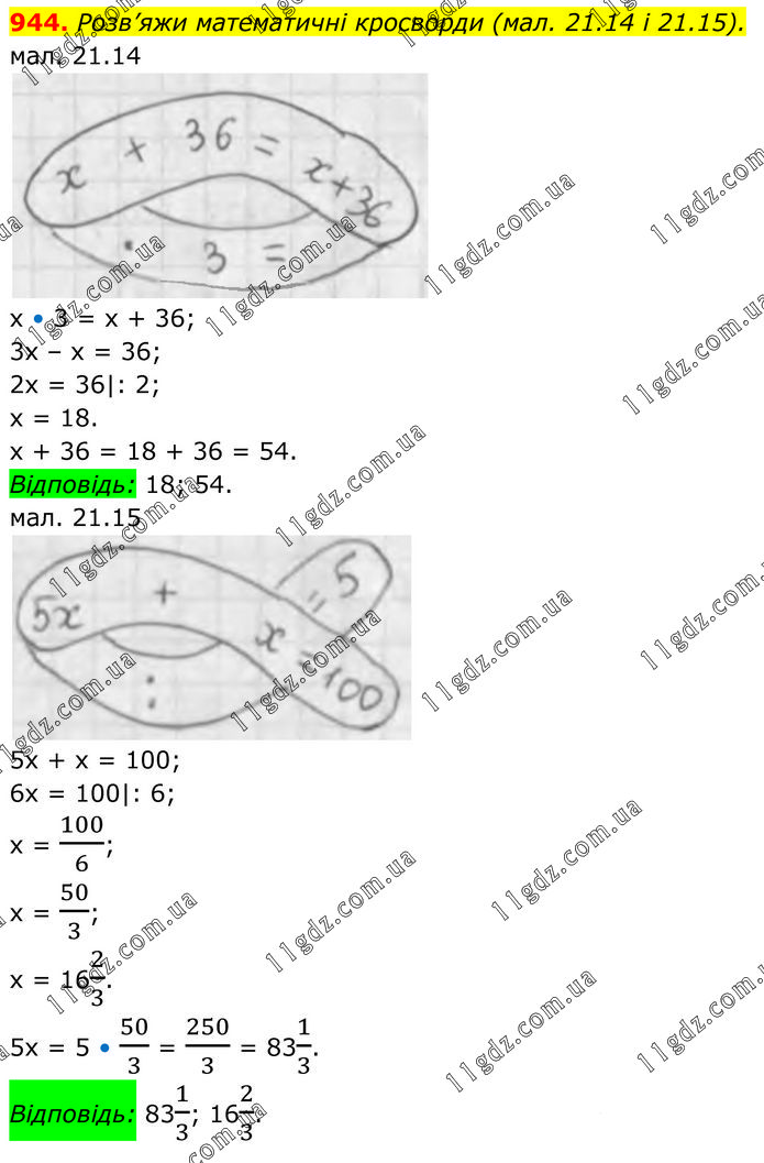 Розв’яжи математичні кросворди (мал. 21.14 і 21.15). мал. 21.14 х • 3 = х + 36; 3х – х = 36; 2х = 36|: 2; x = 18. х + 36 = 18 + 36 = 54. Відповідь: 18; 54. мал. 21.15 5х + х = 100; 6х = 100|: 6; х = 100/6; х = 50/3; х = 162/3. 5х = 5 • 50/3 = 250/3 = 831/3. Відповідь: 831/3; 162/3.
