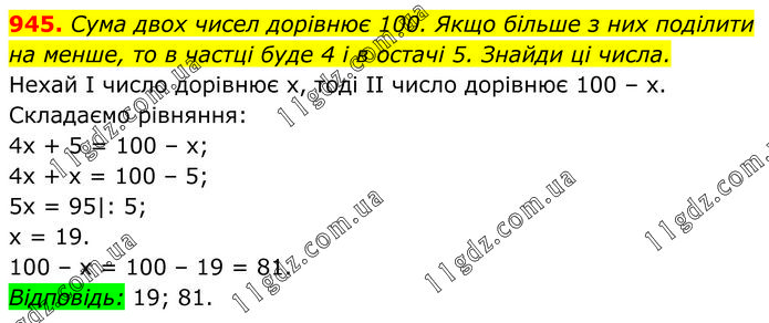 Сума двох чисел дорівнює 100. Якщо більше з них поділити на менше, то в частці буде 4 і в остачі 5. Знайди ці числа. Нехай І число дорівнює х, тоді ІІ число дорівнює 100 – х. Складаємо рівняння: 4х + 5 = 100 – х; 4х + х = 100 – 5; 5х = 95|: 5; х = 19. 100 – х = 100 – 19 = 81. Відповідь: 19; 81.