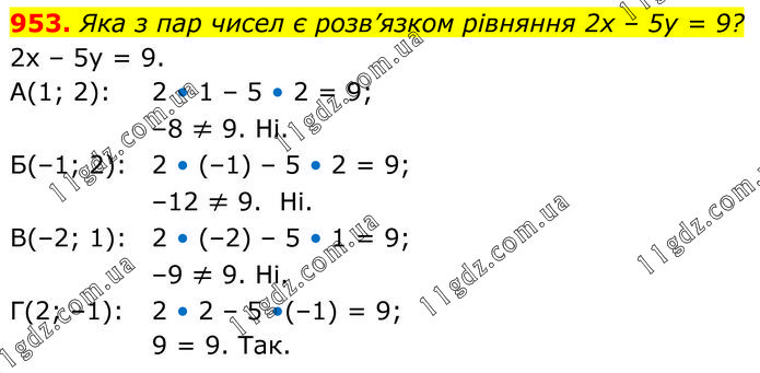 Яка з пар чисел є розв’язком рівняння 2х – 5у = 9? 2х – 5у = 9. А(1; 2): 2 • 1 – 5 • 2 = 9; –8 ≠ 9. Ні. Б(–1; 2): 2 • (–1) – 5 • 2 = 9; –12 ≠ 9. Ні. В(–2; 1): 2 • (–2) – 5 • 1 = 9; –9 ≠ 9. Ні. Г(2; –1): 2 • 2 – 5 •(–1) = 9; 9 = 9. Так.