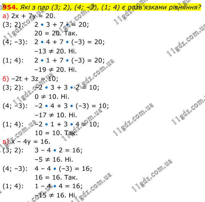 Які з пар (3; 2), (4; –3), (1; 4) є розв’язками рівняння? а) 2х + 7у = 20. (3; 2): 2 • 3 + 7 • = 20; 20 = 20. Так. (4; –3): 2 • 4 + 7 • (–3) = 20; –13 ≠ 20. Ні. (1; 4): 2 • 1 + 7 • (–3) = 20; –19 ≠ 20. Ні. б) –2t + 3z = 10; (3; 2): –2 • 3 + 3 • 2 = 10; 0 ≠ 10. Ні. (4; –3): –2 • 4 + 3 • (–3) = 10; –17 ≠ 10. Ні. (1; 4): –2 • 1 + 3 • 4 = 10; 10 = 10. Так. в) х – 4у = 16. (3; 2): 3 – 4 • 2 = 16; –5 ≠ 16. Ні. (4; –3): 4 – 4 • (–3) = 16; 16 = 16. Так. (1; 4): 1 – 4 • 4 = 16; –15 ≠ 16. Ні.