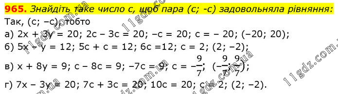 Знайдіть таке число с, щоб пара (с; -с) задовольняла рівняння: Так, (с; –с), тобто а) 2х + 3у = 20; 2с – Зс = 20; –с = 20; с = – 20; (–20; 20); б) 5х – у = 12; 5с + с = 12; 6с =12; с = 2; (2; –2); в) х + 8y = 9; с – 8с = 9; –7с = 9; с = –9/7; (–9/7; 9/7); г) 7x – 3y = 20; 7с + Зс = 20; 10с = 20; с = 2; (2; –2).