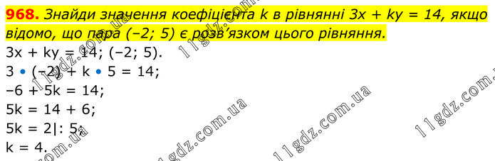 Знайди значення коефіцієнта k в рівнянні 3x + ky = 14, якщо відомо, що пара (–2; 5) є розв’язком цього рівняння. 3х + ky = 14; (–2; 5). 3 • (–2) + k • 5 = 14; –6 + 5k = 14; 5k = 14 + 6; 5k = 2|: 5; k = 4.