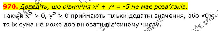 Доведіть, що рівняння х2 + у2 = -5 не має розв’язків. Так як x2 ≥ 0, у2 ≥ 0 приймають тільки додатні значення, або «0», то їх сума не може дорівнювати від’ємному числу.