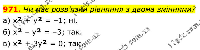 Чи має розв’язки рівняння з двома змінними? а) x² + y² = –1; ні. б) x² – y² = –3; так. в) x² + 3y² = 0; так.