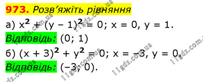Розв’яжіть рівняння a) x2 + (у – 1)2 = 0; х = 0, у = 1. Відповідь: (0; 1) б) (х + З)2 + у2 = 0; х = –3, у = 0. Відповідь: (–3; 0).