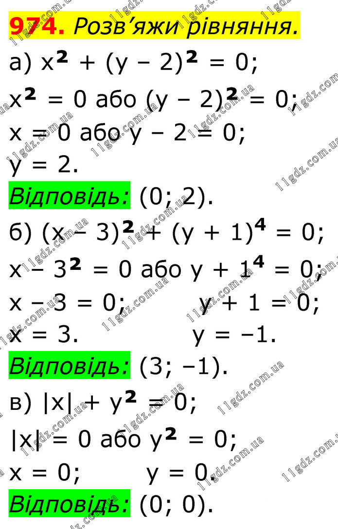 Розв’яжи рівняння. а) x² + (y – 2)² = 0; x² = 0 або (y – 2)² = 0; x = 0 або y – 2 = 0; y = 2. Відповідь: (0; 2). б) (x – 3)² + (y + 1)4 = 0; x – 3² = 0 або y + 14 = 0; x – 3 = 0; y + 1 = 0; x = 3. y = –1. Відповідь: (3; –1). в) |х| + y² = 0; |x| = 0 або y² = 0; x = 0; y = 0. Відповідь: (0; 0).