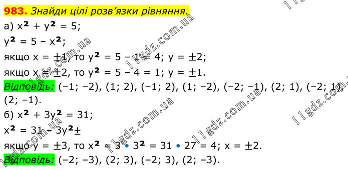 Знайди цілі розв’язки рівняння. а) x² + y² = 5; y² = 5 – x²; якщо x = ±1, то y² = 5 – 1 = 4; y = ±2; якщо x = ±2, то y² = 5 – 4 = 1; y = ±1. Відповідь: (–1; –2), (1; 2), (–1; 2), (1; –2), (–2; –1), (2; 1), (–2; 1), (2; –1). б) x² + 3y² = 31; x² = 31 – 3y²± якщо y = ±3, то x² = 3 • 3² = 31 • 27 = 4; x = ±2. Відповідь: (–2; –3), (2; 3), (–2; 3), (2; –3).