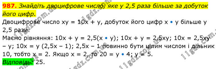 Знайдіть двоцифрове число, яке у 2,5 раза більше за добуток його цифр. Двоцифрове число ху = 10x + у, добуток його цифр х • у більше у 2,5 рази. Маємо рівняння: 10x + у = 2,5(х • у); 10x + у = 2,5ху; 10x = 2,5ху – у; 10х = у (2,5х – 1); 2,5х – 1 повинно бути цілим числом і дільник 10, тобто х = 2. Якщо х = 2, то 20 = у • 4; у = 5. Відповідь: 25.