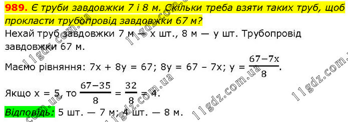 Є труби завдовжки 7 і 8 м. Скільки треба взяти таких труб, щоб прокласти трубопровід завдовжки 67 м? Нехай труб завдовжки 7 м — х шт., 8 м — у шт. Трубопровід завдовжки 67 м. Маємо рівняння: 7х + 8у = 67; 8у = 67 – 7х; у = (67-7х)/8. Якщо х = 5, то (67-35)/8 = 32/8 = 4. Відповідь: 5 шт. — 7 м; 4 шт. — 8 м.