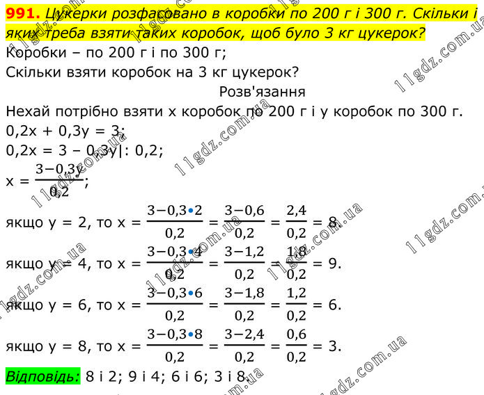 Цукерки розфасовано в коробки по 200 г і 300 г. Скільки і яких треба взяти таких коробок, щоб було 3 кг цукерок? Коробки – по 200 г і по 300 г; Скільки взяти коробок на 3 кг цукерок? Розв'язання Нехай потрібно взяти x коробок по 200 г і y коробок по 300 г. 0,2x + 0,3y = 3; 0,2x = 3 – 0,3y|: 0,2; x = (3-0,3у)/0,2; якщо y = 2, то x = (3-0,3•2)/0,2 = (3-0,6)/0,2 = 2,4/0,2 = 8. якщо y = 4, то x = (3-0,3•4)/0,2 = (3-1,2)/0,2 = 1,8/0,2 = 9. якщо y = 6, то x = (3-0,3•6)/0,2 = (3-1,8)/0,2 = 1,2/0,2 = 6. якщо y = 8, то x = (3-0,3•8)/0,2 = (3-2,4)/0,2 = 0,6/0,2 = 3. Відповідь: 8 і 2; 9 і 4; 6 і 6; 3 і 8.