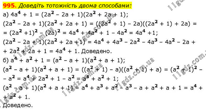 Доведіть тотожність двома способами: а) 4а4 + 1 = (2а2 – 2а + 1)(2а2 + 2а + 1); (2а2 – 2а + 1)(2а2 + 2а + 1) = ((2а2 + 1) – 2а)((2а2 + 1) + 2а) = (2а2 +1)2 – (2а)2 = 4а4 + 4a2 + 1 – 4a2 = 4а4 +1; (2а2 – 2а + 1)(2а2 + 2а +1) = 4а4 + 4a3 – 2a2 – 4a3 – 4a2 – 2a + 2a2 + 2a + 1 = 4а4 + 1. Доведено. б) а4 + а2 + 1 = (а2 – а + 1)(а2 + а + 1); (а2 – а + 1)(а2 + а + 1) = ((а2 + 1) – а)((а2 + 1) + а) = (а2 + 1)2 – а2 = а4 + 2а2 + 1 – а2 = а4 + а2 + 1; (а2 – а + 1)(а2 + а + 1) = а4 + a3 + a2 – a3 – a + а2 + a + 1 = а4 + а2 + 1. Доведено.