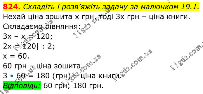 Складіть і розв’яжіть задачу за малюнком 19.1. Нехай ціна зошита х грн, тоді 3х грн – ціна книги. Складаємо рівняння: 3x – x = 120; 2x = 120| : 2; x = 60. 60 грн – ціна зошита. 3 • 60 = 180 (грн) – ціна книги. Відповідь: 60 грн; 180 грн.