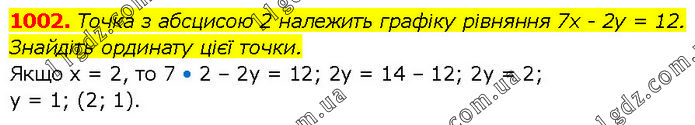 Точка з абсцисою 2 належить графіку рівняння 7х - 2у = 12. Знайдіть ординату цієї точки. Якщо х = 2, то 7 • 2 – 2у = 12; 2у = 14 – 12; 2у = 2; у = 1; (2; 1).