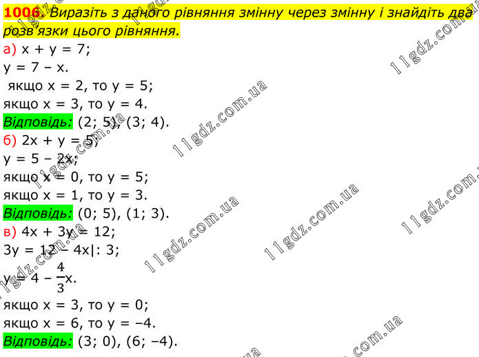 Виразіть з даного рівняння змінну через змінну і знайдіть два розв’язки цього рівняння. а) x + y = 7; y = 7 – x. якщо x = 2, то y = 5; якщо x = 3, то y = 4. Відповідь: (2; 5), (3; 4). б) 2x + y = 5; y = 5 – 2x; якщо x = 0, то y = 5; якщо x = 1, то y = 3. Відповідь: (0; 5), (1; 3). в) 4x + 3y = 12; 3y = 12 – 4x|: 3; y = 4 – 4/3x. якщо x = 3, то y = 0; якщо x = 6, то y = –4. Відповідь: (3; 0), (6; –4).