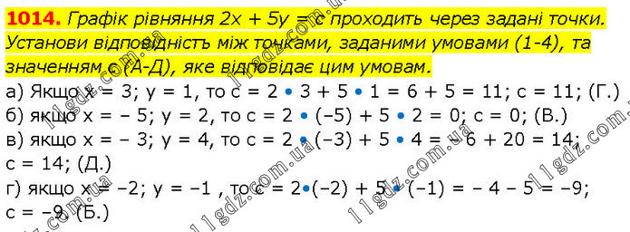 Графiк рiвняння 2х + 5у = с проходить через заданi точки. Установи вiдповiднiстъ мiж точками, заданими умовами (1-4), та значенням с (А-Д), яке вiдповiдає цим умовам. а) Якщо x = 3; у = 1, то с = 2 • 3 + 5 • 1 = 6 + 5 = 11; c = 11; (Г.) б) якщо x = – 5; у = 2, то с = 2 • (–5) + 5 • 2 = 0; с = 0; (В.) в) якщо х = – 3; у = 4, то с = 2 • (–3) + 5 • 4 = – 6 + 20 = 14; с = 14; (Д.) г) якщо x = –2; у = –1 , то c = 2•(–2) + 5 • (–1) = – 4 – 5 = –9; с = –9. (Б.)