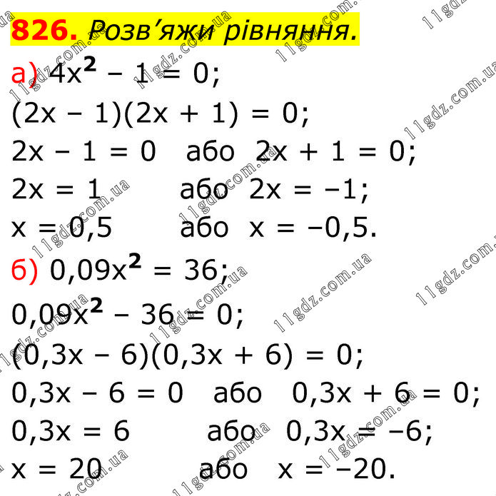 Розв’яжи рівняння. a) 4x2 – 1 = 0; (2x – 1)(2x + 1) = 0; 2x – 1 = 0 або 2x + 1 = 0; 2x = 1 або 2x = –1; x = 0,5 або x = –0,5. б) 0,09x2 = 36; 0,09x2 – 36 = 0; (0,3x – 6)(0,3x + 6) = 0; 0,3x – 6 = 0 або 0,3x + 6 = 0; 0,3x = 6 або 0,3x = –6; x = 20 або x = –20.
