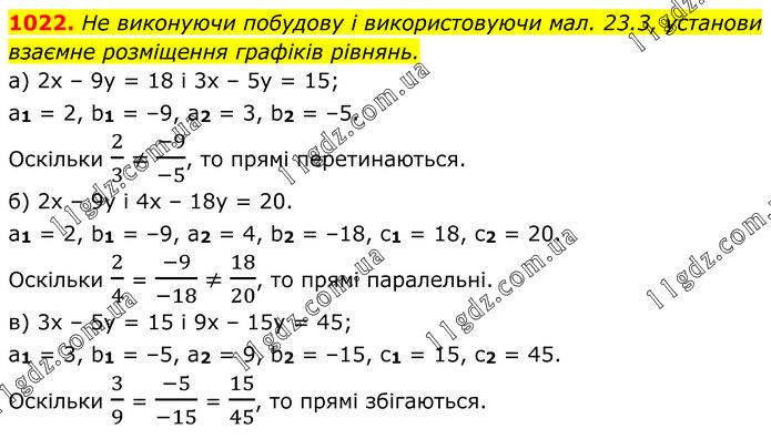 Не виконуючи побудову і використовуючи мал. 23.3, установи взаємне розміщення графіків рівнянь. а) 2х – 9у = 18 і 3х – 5у = 15; а1 = 2, b1 = –9, a2 = 3, b2 = –5. Оскільки 2/3 ≠ (-9)/(-5), то прямі перетинаються. б) 2х – 9у і 4х – 18у = 20. а1 = 2, b1 = –9, a2 = 4, b2 = –18, c1 = 18, c2 = 20. Оскільки 2/4 = (-9)/(-18) ≠ 18/20, то прямі паралельні. в) 3х – 5у = 15 і 9х – 15у = 45; a1 = 3, b1 = –5, a2 = 9, b2 = –15, c1 = 15, c2 = 45. Оскільки 3/9 = (-5)/(-15) = 15/45, то прямі збігаються.