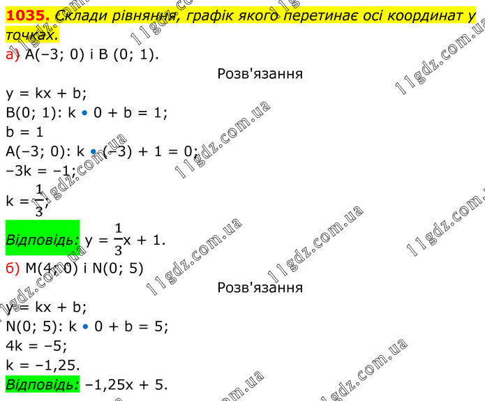 Склади рівняння, графік якого перетинає осі координат у точках. а) А(–3; 0) і В (0; 1). Розв'язання y = kx + b; В(0; 1): k • 0 + b = 1; b = 1 A(–3; 0): k • (–3) + 1 = 0; –3k = –1; k = 1/3; Відповідь: y = 1/3x + 1. б) М(4; 0) і N(0; 5) Розв'язання y = kx + b; N(0; 5): k • 0 + b = 5; 4k = –5; k = –1,25. Відповідь: –1,25x + 5.