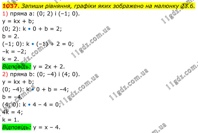 Запиши рівняння, графіки яких зображено на малюнку 23.6. 1) пряма а: (0; 2) і (–1; 0). y = kx + b; (0; 2): k • 0 + b = 2; b = 2. (–1; 0): k • (–1) + 2 = 0; –k = –2; k = 2. Відповідь: y = 2x + 2. 2) пряма b: (0; –4) і (4; 0). y = kx + b; (0; –4): k • 0 + b = –4; b = –4. (4; 0): k • 4 – 4 = 0; 4k = 4; k = 1. Відповідь: y = x – 4.