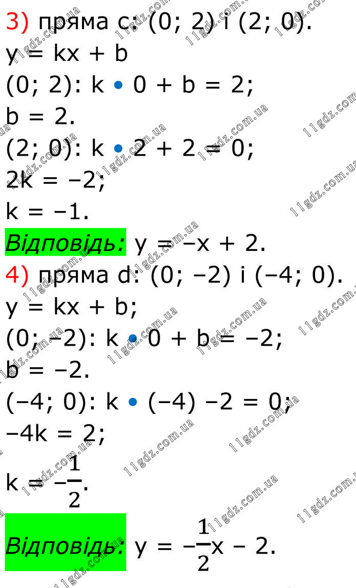 3) пряма с: (0; 2) і (2; 0). y = kx + b (0; 2): k • 0 + b = 2; b = 2. (2; 0): k • 2 + 2 = 0; 2k = –2; k = –1. Відповідь: y = –x + 2. 4) пряма d: (0; –2) і (–4; 0). y = kx + b; (0; –2): k • 0 + b = –2; b = –2. (–4; 0): k • (–4) –2 = 0; –4k = 2; k = –1/2. Відповідь: y = –1/2x – 2.