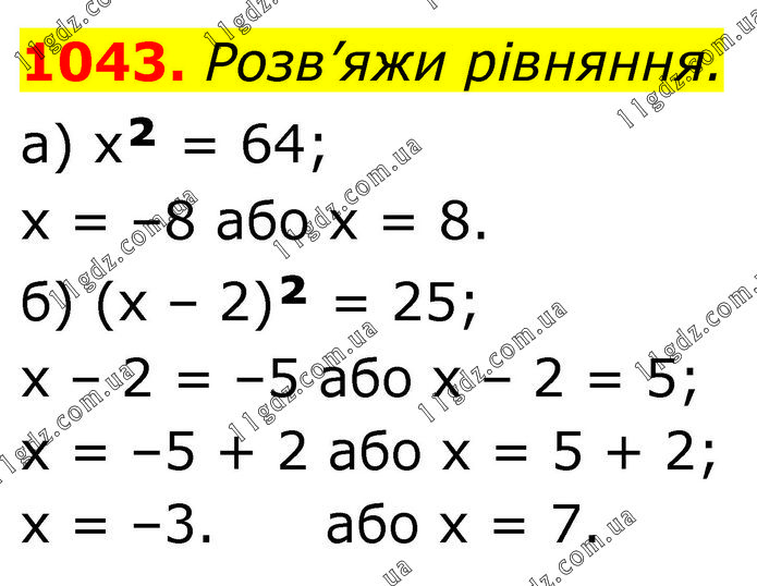 Розв’яжи рівняння. а) x² = 64; x = –8 або x = 8. б) (x – 2)² = 25; x – 2 = –5 або x – 2 = 5; x = –5 + 2 або x = 5 + 2; x = –3. або x = 7.