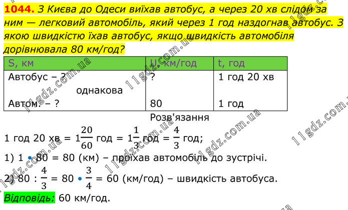 З Києва до Одеси виїхав автобус, а через 20 хв слідом за ним — легковий автомобіль, який через 1 год наздогнав автобус. З якою швидкістю їхав автобус, якщо швидкість автомобіля дорівнювала 80 км/год? Розв'язання 1 год 20 хв = 120/60 год = 11/3 год = 4/3 год; 1) 1 • 80 = 80 (км) – проїхав автомобіль до зустрічі. 2) 80 : 4/3 = 80 • 3/4 = 60 (км/год) – швидкість автобуса. Відповідь: 60 км/год.