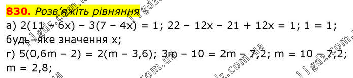 Розв’яжіть рівняння а) 2(11 – 6x) – 3(7 – 4x) = 1; 22 – 12x – 21 + 12x = 1; 1 = 1; будь–яке значення x; г) 5(0,6m – 2) = 2(m – 3,6); 3m – 10 = 2m – 7,2; m = 10 – 7,2; m = 2,8;
