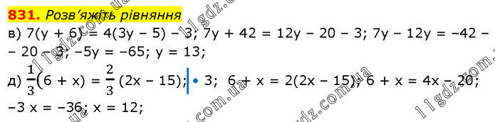 Розв’яжіть рівняння в) 7(у + 6) = 4(3у – 5) – 3; 7у + 42 = 12у – 20 – 3; 7y – 12у = –42 – – 20 – 3; –5y = –65; у = 13; д) 1/3(6 + х) = 2/3 (2х – 15); • 3; 6 + x = 2(2x – 15); 6 + x = 4х – 20; –3 x = –36; х = 12;