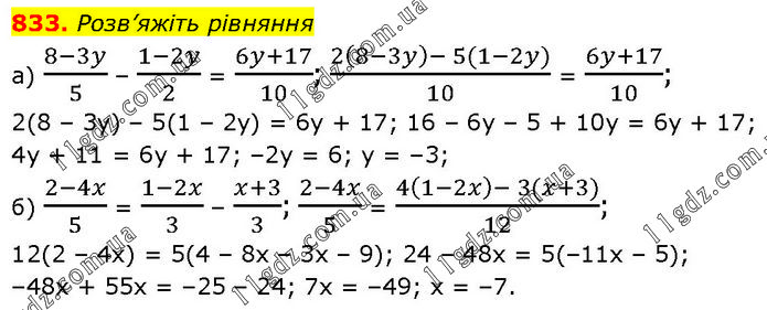 Розв’яжіть рівняння a) (8-3y)/5 – (1-2y)/2 = (6y+17)/10; (2(8-3y)- 5(1-2y))/10 = (6y+17)/10; 2(8 – 3у) – 5(1 – 2у) = 6у + 17; 16 – 6у – 5 + 10y = 6у + 17; 4у + 11 = 6у + 17; –2у = 6; у = –3; б) (2-4x)/5 = (1-2x)/3 – (x+3)/3; (2-4x)/5 = (4(1-2x)- 3(x+3))/12; 12(2 – 4x) = 5(4 – 8x – 3x – 9); 24 – 48x = 5(–11x – 5); –48x + 55x = –25 – 24; 7x = –49; x = –7.
