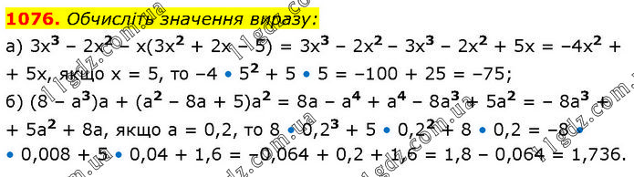 Обчисліть значення виразу: a) 3x3 – 2х2 – x(3x2 + 2х – 5) = 3x3 – 2х2 – 3x3 – 2х2 + 5х = –4х2 + 5х, якщо х = 5, то –4 • 52 + 5 • 5 = –100 + 25 = –75; б) (8 – a3)a + (a2 – 8a + 5)a2 = 8a – a4 + a4 – 8a3 + 5a2 = – 8a3 + 5a2 + 8a, якщо a = 0,2, тo 8 • 0,23 + 5 • 0,22 + 8 • 0,2 = –8 • 0,008 + 5 • 0,04 + 1,6 = –0,064 + 0,2 + 1,6 = 1,8 – 0,064 = 1,736.