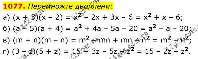Перемножте двочлени: a) (x + 3)(x – 2) = x2 – 2x + 3x – 6 = x2 + x – 6; б) (a – 5)(a + 4) = a2 + 4a – 5a – 20 = a2 – a – 20; в) (m + n)(m – n) = m2 – mn + mn – n2 = m2 – n2; г) (3 – z)(5 + z) = 15 + 3z – 5z – z2 = 15 – 2z – z2.