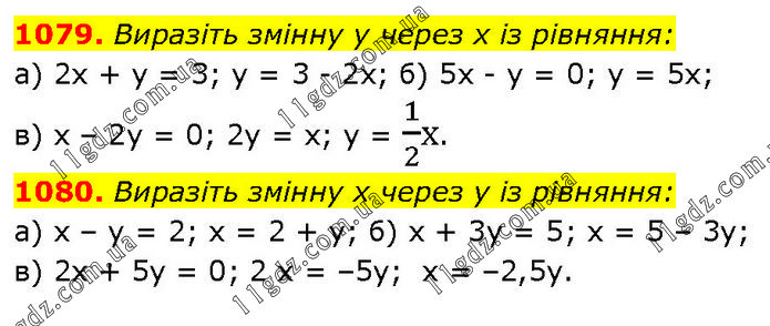 1079. Виразіть змінну у через х із рівняння: а) 2х + у = 3; у = 3 - 2х; б) 5х - y = 0; y = 5х; в) х – 2у = 0; 2у = х; у = 1/2x. 1080. Виразіть змінну х через у із рівняння: а) х – у = 2; х = 2 + у; б) х + 3y = 5; х = 5 – 3y; в) 2х + 5у = 0; 2 х = –5у; х = –2,5y.