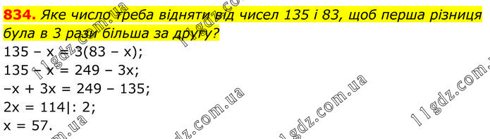 Яке число треба відняти від чисел 135 і 83, щоб перша різниця була в 3 рази більша за другу? 135 – x = 3(83 – x); 135 – x = 249 – 3x; –x + 3x = 249 – 135; 2x = 114|: 2; x = 57.