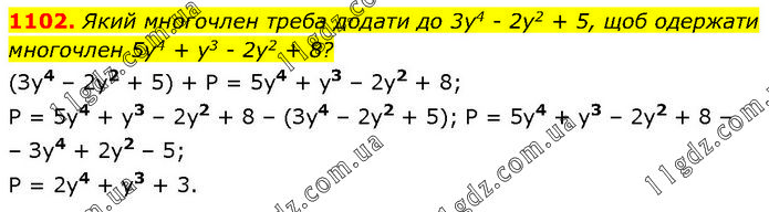 Який многочлен треба додати до 3у4 - 2у2 + 5, щоб одержати многочлен 5у4 + у3 - 2у2 + 8? (Зу4 – 2y2 + 5) + P = 5y4 + y3 – 2y2 + 8; P = 5y4 + y3 – 2y2 + 8 – (Зy4 – 2y2 + 5); P = 5y4 + y3 – 2y2 + 8 – – Зy4 + 2y2 – 5; P = 2y4 + y3 + 3.