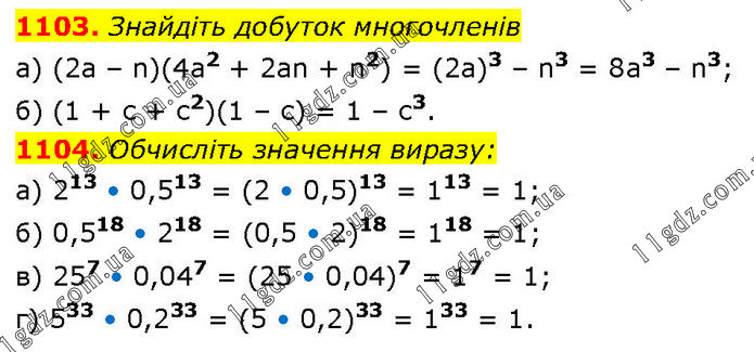 1103. Знайдіть добуток многочленів а) (2а – n)(4а2 + 2an + n2) = (2а)3 – n3 = 8a3 – n3; б) (1 + с + с2)(1 – с) = 1 – с3. 1104. Обчисліть значення виразу: a) 213 • 0,513 = (2 • 0,5)13 = 113 = 1; б) 0,518 • 218 = (0,5 • 2)18 = 118 = 1; в) 257 • 0,047 = (25 • 0,04)7 = 17 = 1; г) 533 • 0,233 = (5 • 0,2)33 = 133 = 1.