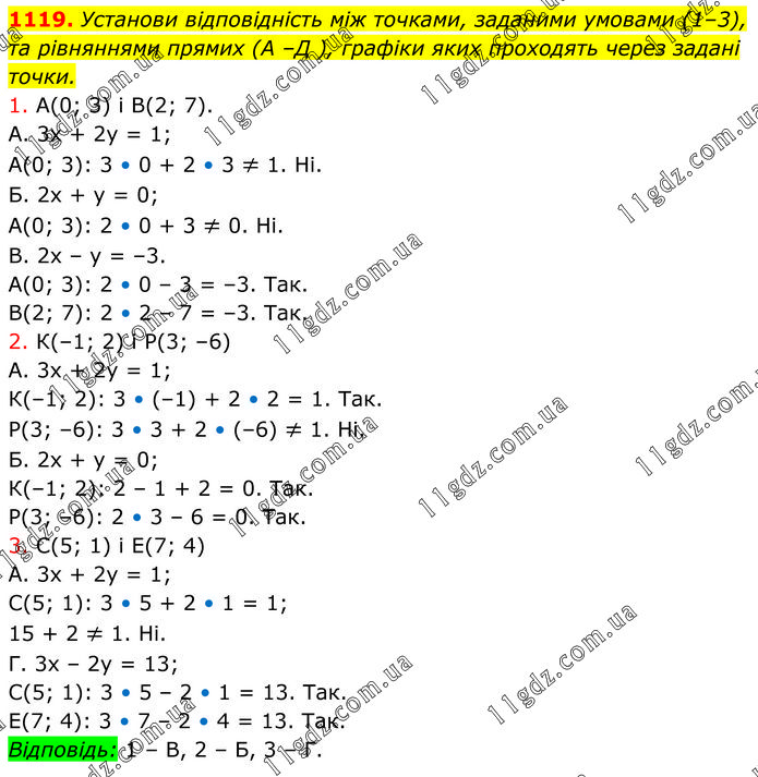 Установи відповідність між точками, заданими умовами (1–3), та рівняннями прямих (А –Д ), графіки яких проходять через задані точки. 1. А(0; 3) і В(2; 7). А. 3х + 2y = 1; А(0; 3): 3 • 0 + 2 • 3 ≠ 1. Ні. Б. 2x + y = 0; А(0; 3): 2 • 0 + 3 ≠ 0. Ні. В. 2x – y = –3. А(0; 3): 2 • 0 – 3 = –3. Так. В(2; 7): 2 • 2 – 7 = –3. Так. 2. К(–1; 2) і Р(3; –6) А. 3х + 2y = 1; К(–1; 2): 3 • (–1) + 2 • 2 = 1. Так. Р(3; –6): 3 • 3 + 2 • (–6) ≠ 1. Ні. Б. 2x + y = 0; К(–1; 2): 2 – 1 + 2 = 0. Так. Р(3; –6): 2 • 3 – 6 = 0. Так. 3. С(5; 1) і Е(7; 4) А. 3х + 2у = 1; С(5; 1): 3 • 5 + 2 • 1 = 1; 15 + 2 ≠ 1. Ні. Г. 3х – 2y = 13; С(5; 1): 3 • 5 – 2 • 1 = 13. Так. Е(7; 4): 3 • 7 – 2 • 4 = 13. Так. Відповідь: 1 – В, 2 – Б, 3 – Г.