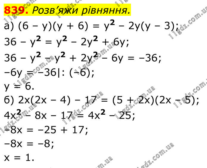 Розв’яжи рівняння. a) (6 – y)(y + 6) = y2 – 2y(y – 3); 36 – y2 = y2 – 2y2 + 6y; 36 – y2 – y2 + 2y2 – 6y = –36; –6y = –36|: (–6); y = 6. б) 2x(2x – 4) – 17 = (5 + 2x)(2x – 5); 4x2 – 8x – 17 = 4x2 – 25; –8x = –25 + 17; –8x = –8; x = 1.
