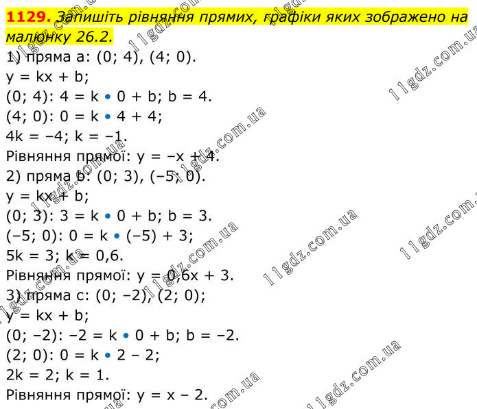 Запишіть рівняння прямих, графіки яких зображено на малюнку 26.2. 1) пряма а: (0; 4), (4; 0). y = kx + b; (0; 4): 4 = k • 0 + b; b = 4. (4; 0): 0 = k • 4 + 4; 4k = –4; k = –1. Рівняння прямої: y = –x + 4. 2) пряма b: (0; 3), (–5; 0). y = kx + b; (0; 3): 3 = k • 0 + b; b = 3. (–5; 0): 0 = k • (–5) + 3; 5k = 3; k = 0,6. Рівняння прямої: y = 0,6x + 3. 3) пряма с: (0; –2), (2; 0); y = kx + b; (0; –2): –2 = k • 0 + b; b = –2. (2; 0): 0 = k • 2 – 2; 2k = 2; k = 1. Рівняння прямої: y = x – 2.