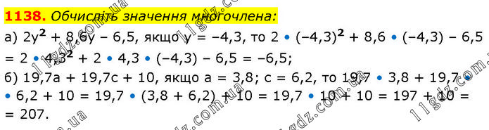 Обчисліть значення многочлена: а) 2y2 + 8,6у – 6,5, якщо y = –4,3, то 2 • (–4,3)2 + 8,6 • (–4,3) – 6,5 = 2 • 4,32 + 2 • 4,3 • (–4,3) – 6,5 = –6,5; б) 19,7а + 19,7с + 10, якщо а = 3,8; с = 6,2, то 19,7 • 3,8 + 19,7 • 6,2 + 10 = 19,7 • (3,8 + 6,2) + 10 = 19,7 • 10 + 10 = 197 + 10 = 207.