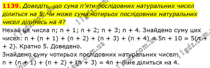 Доведіть, що сума п’яти послідовних натуральних чисел ділиться на 5. Чи може сума чотирьох послідовних натуральних чисел ділитись на 4? Нехай це числа n; n + 1; n + 2; n + 3; n + 4. Знайдемо суму цих чисел: n + (n + 1) + (n + 2) + (n + 3) + (n + 4) = 5n + 10 = 5(n + 2). Кратно 5. Доведено. Знайдемо суму чотирьох послідовних натуральних чисел: n + (n + 1) + (n + 2) + (n + 3) = 4n + 6 не ділиться на 4.