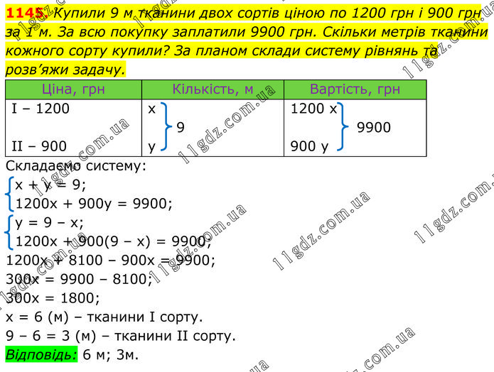 Купили 9 м тканини двох сортів ціною по 1200 грн і 900 грн за 1 м. За всю покупку заплатили 9900 грн. Скільки метрів тканини кожного сорту купили? За планом склади систему рівнянь та розв’яжи задачу. Складаємо систему: х + y = 9; 1200x + 900y = 9900; y = 9 – x; 1200x + 900(9 – x) = 9900; 1200x + 8100 – 900x = 9900; 300x = 9900 – 8100; 300x = 1800; x = 6 (м) – тканини І сорту. 9 – 6 = 3 (м) – тканини ІІ сорту. Відповідь: 6 м; 3м.