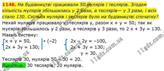На будівництві працювали 50 мулярів і теслярів. Згодом кількість мулярів збільшилась у 2 рази, а теслярів— у 3 рази, і всіх стало 130. Скільки мулярів і теслярів було на будівництві спочатку? Нехай мулярів працювало х, теслярів у, разом х + у = 50; так як мулярів збільшилось у 2 рази, а теслярів у 3 рази, то 2 х + Зу = 130. Маємо систему: Теслярів 30, мулярів 50 – 30 = 20. Відповідь: 30 теслярів; 20 мулярів.