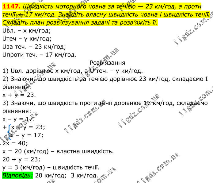 Швидкість моторного човна за течією — 23 км/год, а проти течії — 17 км/год. Знайдіть власну швидкість човна і швидкість течії. Складіть план розв’язування задачі та розв’яжіть її. Uвл. – х км/год; Uтеч – у км/год; Uза теч. – 23 км/год; Uпроти теч. – 17 км/год. Розв’язання 1) Uвл. дорівнює х км/год, а U теч. – у км/год. 2) Знаючи, що швидкість за течією дорівнює 23 км/год, складаємо І рівняння: х + у = 23. 3) Знаючи, що швидкість проти течії дорівнює 17 км/год, складаємо рівняння: х – у = 17. + х + у = 23; х – у = 17; 2х = 40; х = 20 (км/год) – властна швидкість. 20 + у = 23; у = 3 (км/год) – швидкість течії. Відповідь: 20 км/год; 3 км/год.