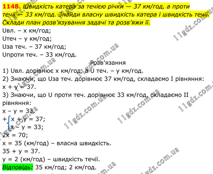 Швидкість катера за течією річки — 37 км/год, а проти течії — 33 км/год. Знайди власну швидкість катера і швидкість течії. Склади план розв’язування задачі та розв’яжи її. Uвл. – х км/год; Uтеч – у км/год; Uза теч. – 37 км/год; Uпроти теч. – 33 км/год. Розв’язання 1) Uвл. дорівнює х км/год, а U теч. – у км/год. 2) Знаючи, що Uза теч. дорівнює 37 км/год, складаємо І рівняння: х + у = 37. 3) Знаючи, що U проти теч. дорівнює 33 км/год, складаємо ІІ рівняння: х – у = 33. + х + у = 37; х – у = 33; 2х = 70; х = 35 (км/год) – власна швидкість. 35 + у = 37. у = 2 (км/год) – швидкість течії. Відповідь: 35 км/год; 2 км/год.