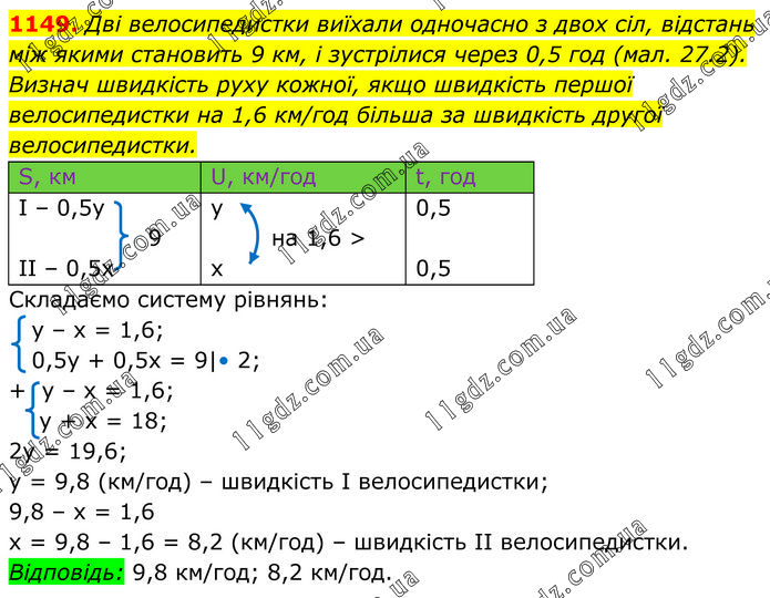 Дві велосипедистки виїхали одночасно з двох сіл, відстань між якими становить 9 км, і зустрілися через 0,5 год (мал. 27.2). Визнач швидкість руху кожної, якщо швидкість першої велосипедистки на 1,6 км/год більша за швидкість другої велосипедистки. Складаємо систему рівнянь: y – x = 1,6; 0,5y + 0,5x = 9|• 2; + y – x = 1,6; y + x = 18; 2y = 19,6; у = 9,8 (км/год) – швидкість І велосипедистки; 9,8 – х = 1,6 х = 9,8 – 1,6 = 8,2 (км/год) – швидкість ІІ велосипедистки. Відповідь: 9,8 км/год; 8,2 км/год.