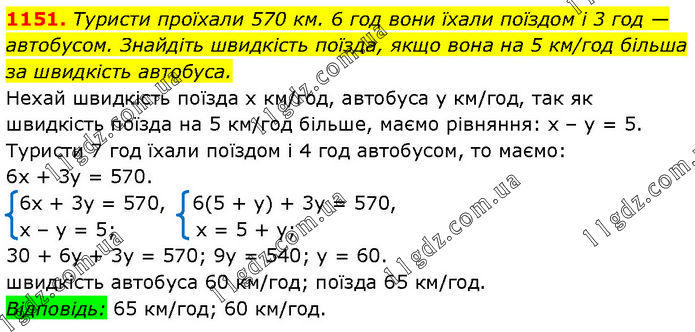 Туристи проїхали 570 км. 6 год вони їхали поїздом і 3 год — автобусом. Знайдіть швидкість поїзда, якщо вона на 5 км/год більша за швидкість автобуса. Нехай швидкість поїзда х км/год, автобуса у км/год, так як швидкість поїзда на 5 км/год більше, маємо рівняння: х – у = 5. Туристи 7 год їхали поїздом і 4 год автобусом, то маємо: 6х + 3у = 570. 6х + 3у = 570, 6(5 + у) + 3у = 570, х – у = 5; х = 5 + у; 30 + 6у + 3у = 570; 9у = 540; у = 60. швидкість автобуса 60 км/год; поїзда 65 км/год. Відповідь: 65 км/год; 60 км/год.