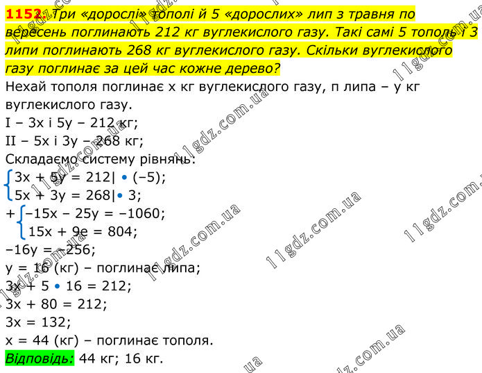 Три «дорослі» тополі й 5 «дорослих» лип з травня по вересень поглинають 212 кг вуглекислого газу. Такі самі 5 тополь і 3 липи поглинають 268 кг вуглекислого газу. Скільки вуглекислого газу поглинає за цей час кожне дерево? Нехай тополя поглинає х кг вуглекислого газу, п липа – у кг вуглекислого газу. І – 3х і 5у – 212 кг; ІІ – 5х і 3у – 268 кг; Складаємо систему рівнянь: 3х + 5у = 212| • (–5); 5x + 3y = 268|• 3; + –15x – 25y = –1060; 15x + 9e = 804; –16y = –256; у = 16 (кг) – поглинає липа; 3х + 5 • 16 = 212; 3х + 80 = 212; 3х = 132; х = 44 (кг) – поглинає тополя. Відповідь: 44 кг; 16 кг.